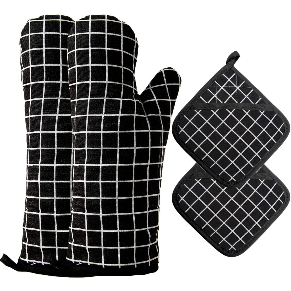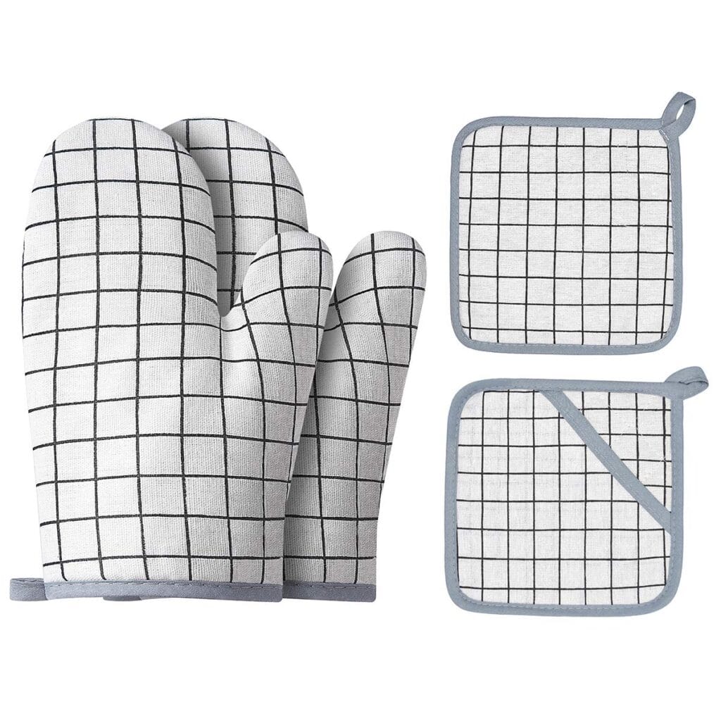 These oven mitts and pot holders truly stand out in our kitchen. The heat resistance is impressive, making it easy to handle hot plates and pots without fear of burns. We appreciate the thick cotton and silicone design, which gives a nice balance of comfort and function.