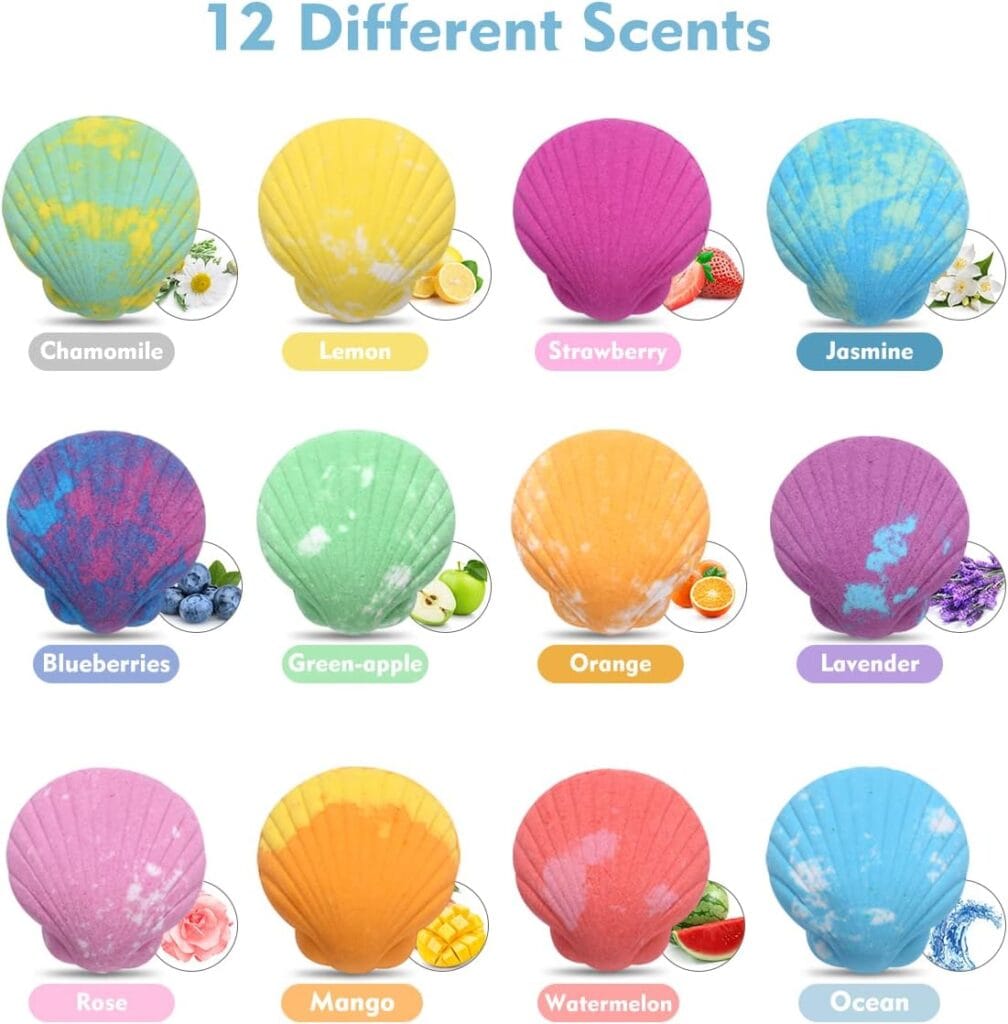 The bath bombs come in 12 amazing scents, including Ocean, Blueberries, Mango, Green-apple, Orange, Lavender, Lemon, Strawberry, Chamomile, Rose, Jasmine, and Watermelon. They are made with safe and gentle ingredients to ensure that they are safe for children, moisturizing and soothe your skin without feeling greasy. Plus, they will not stain your skin and bathtub.